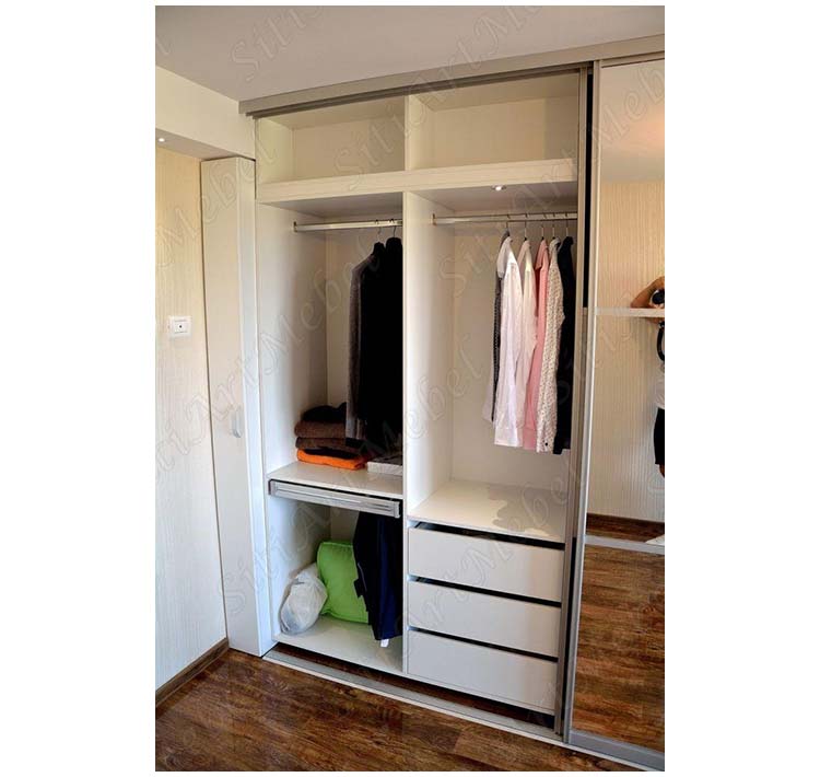 Однотонный шкаф-купе без зеркал с полками справа. Ширина 152 см.