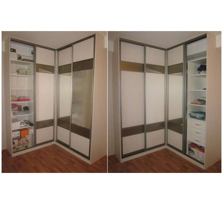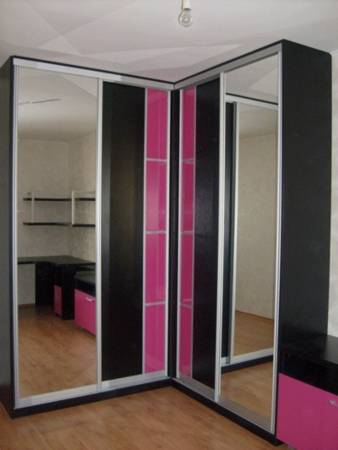 Две створки шкафа заполнены сплошным зеркалом в полный рост. Декор двух других створок представляет собой сочетание черных и розовых вставок. Угловое исполнение позволит сэкономить место в комнате.