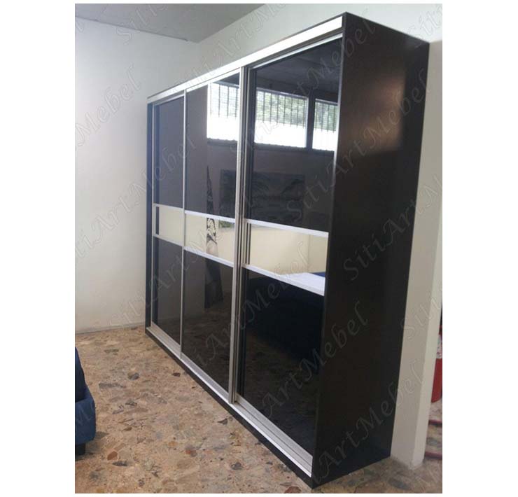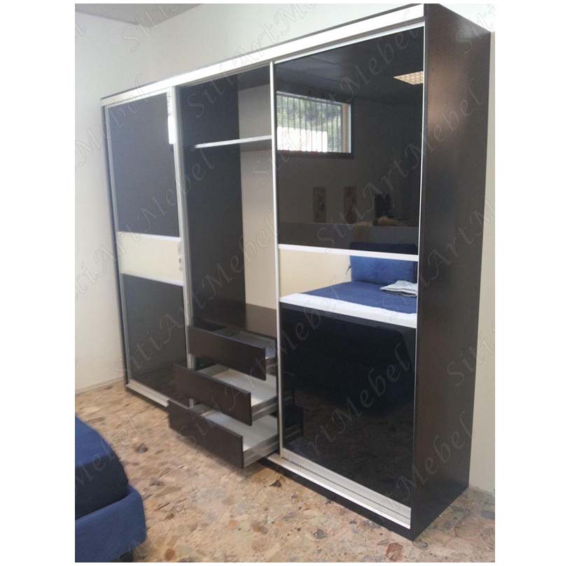 Трехстворчатая модель с черным глянцевым фасадом, украшенным зеркальной вставкой, прекрасно подойдет для обустройства современной спальни или прихожей. За счет качественной фурнитуры створки модели работают плавно и практически бесшумно. Хорошо продуманное внутреннее наполнение позволит с комфортом хранить всю вашу одежду.