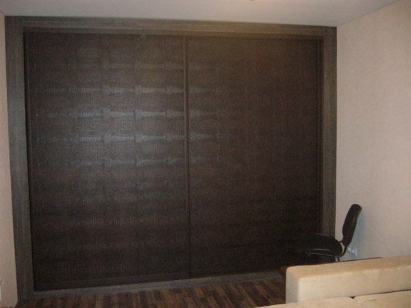 Шкаф-купе внутри оснащен компьютерным столом с полками. Он может одновременно являться и гардеробом и рабочим местом. Модель окрашена в черный цвет, придающий ей строгость и солидность.