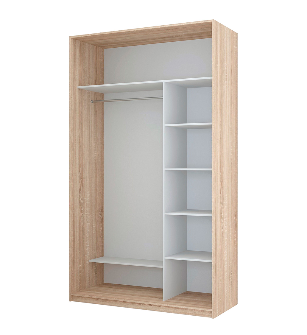 Двухцветный шкаф-купе без зеркал с полками слева. Ширина 152 см.
