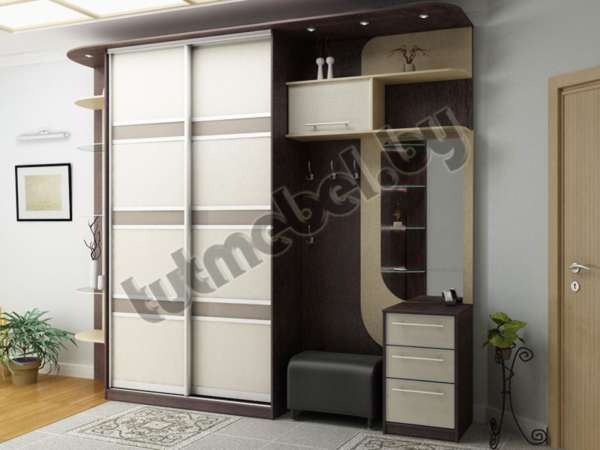 Шкаф-купе в прихожую с тумбой и банкеткой. В изготовлении шкафа-купе использована алюминиевая система раздвижных дверей "Сенатор".