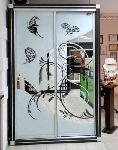 Эта изящная модель состоит из двух раздвижных створок, заполненных зеркалом. Зеркальная поверхность, в свою очередь, украшена пескоструйным рисунком в светлых и темных тонах.