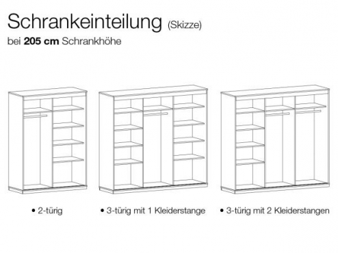 Три отсека шкафа с полками, двумя штангами, четырьмя выдвижными ящиками.