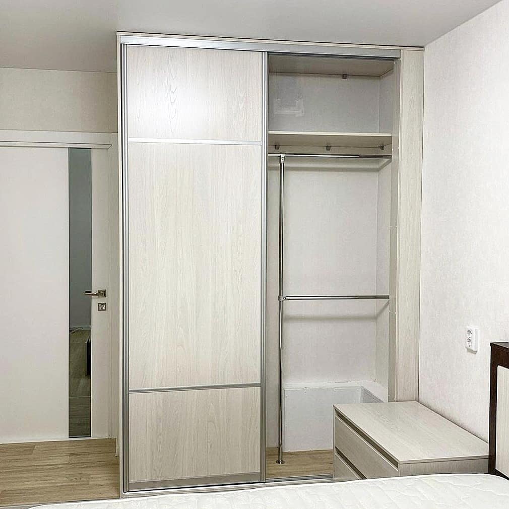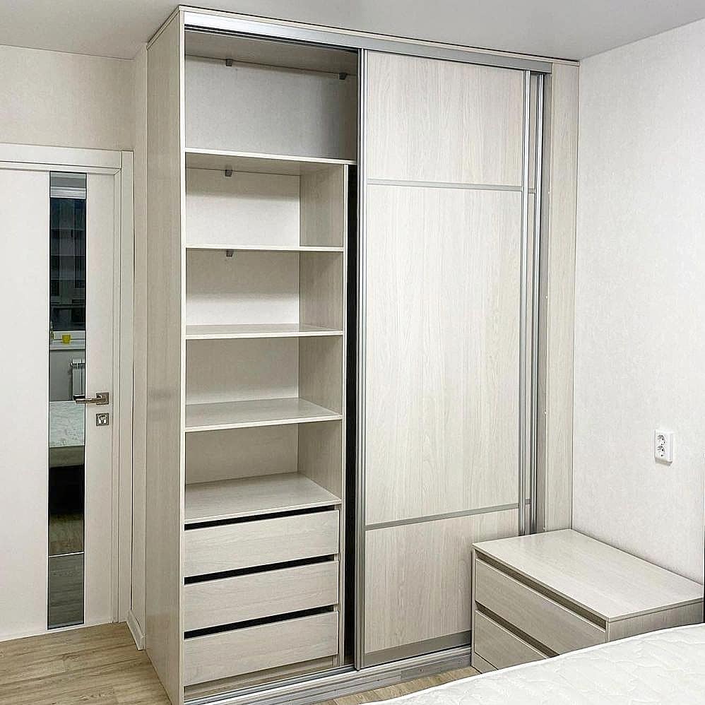 Шкаф-купе глубиной 60 см содержит штангу для вешалок, полки и выдвижные ящики внутри.