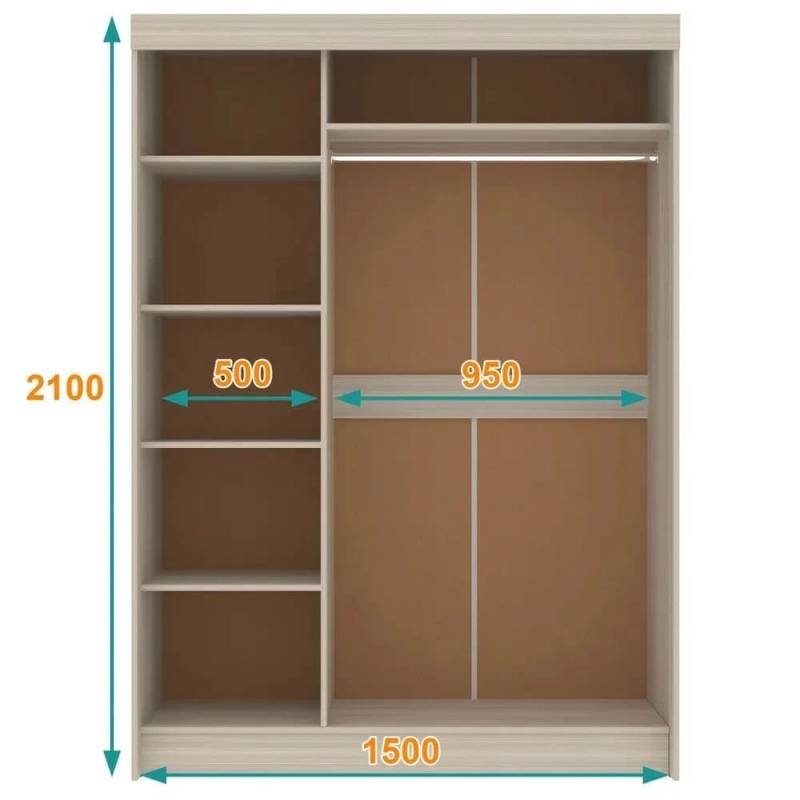 Двери без зеркал, стеллаж с полками слева. Ширина 152 см.