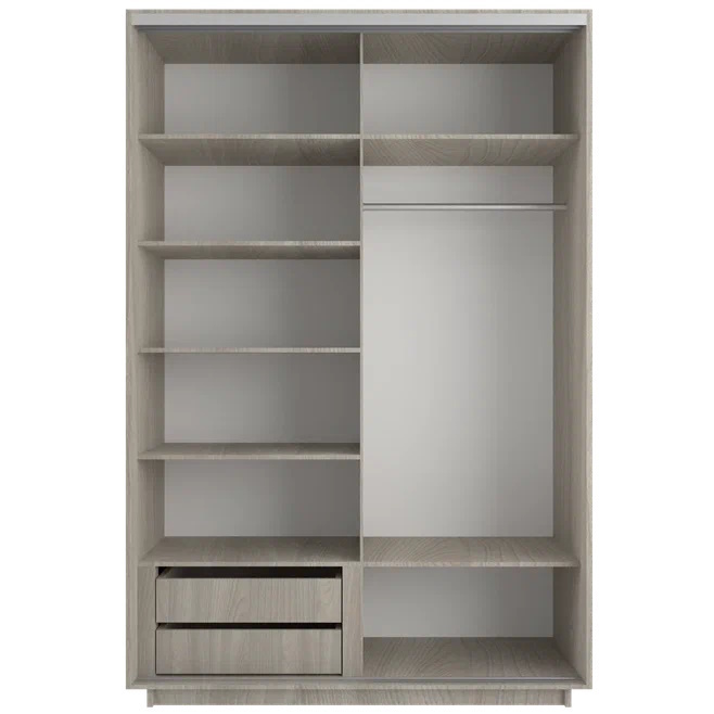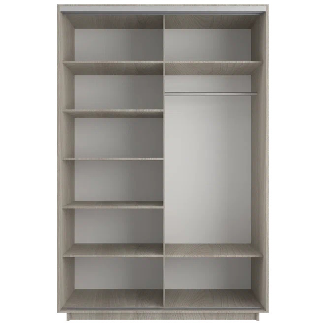 Двухцветный шкаф-купе без зеркал с полками справа. Ширина 152 см.