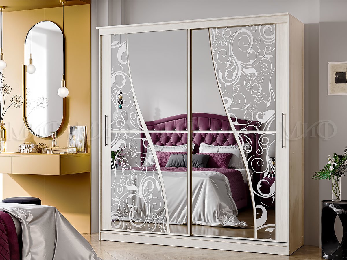 код 102981Линейный шкаф-купе с декорированными створками. Большие зеркала с пескоструем.