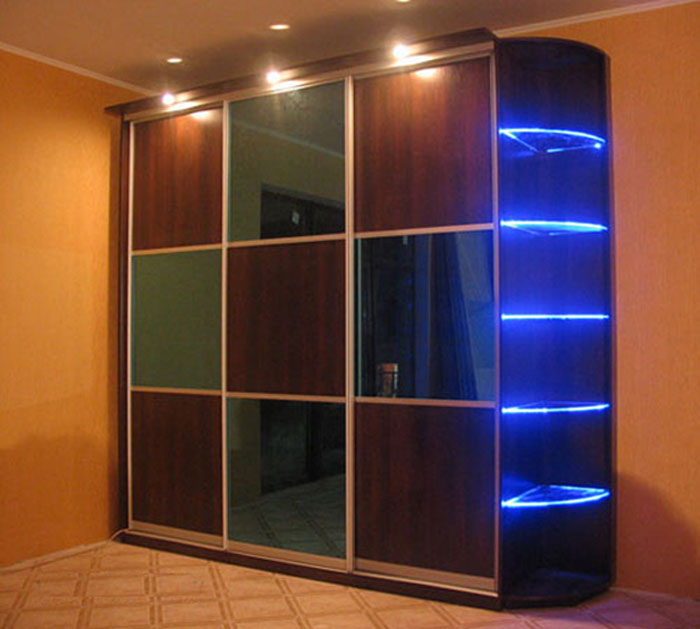 Трехстворчатый шкаф-купе сразу же привлекает внимание своим оригинальным и невероятно стильным дизайном, который с легкостью расскажет гостям о индивидуальном и безупречном вкусе его обладателя. Стеклянные угловые полки оснащены синей неоновой подсветкой, которая будет завораживающе выглядеть в темное время суток, а также позволит создать удивительную и неповторимую атмосферу. Также очень удобно и позволит сэкономить пространство - наличие точечной подсветки и на небольшом козырьке.