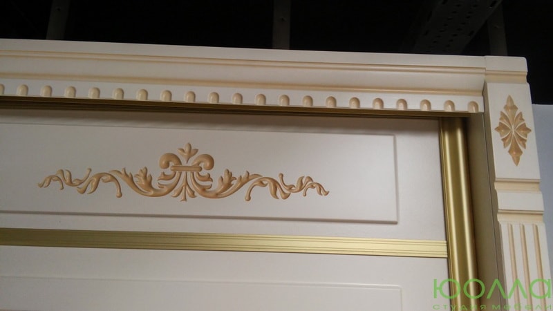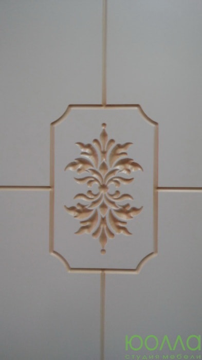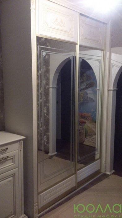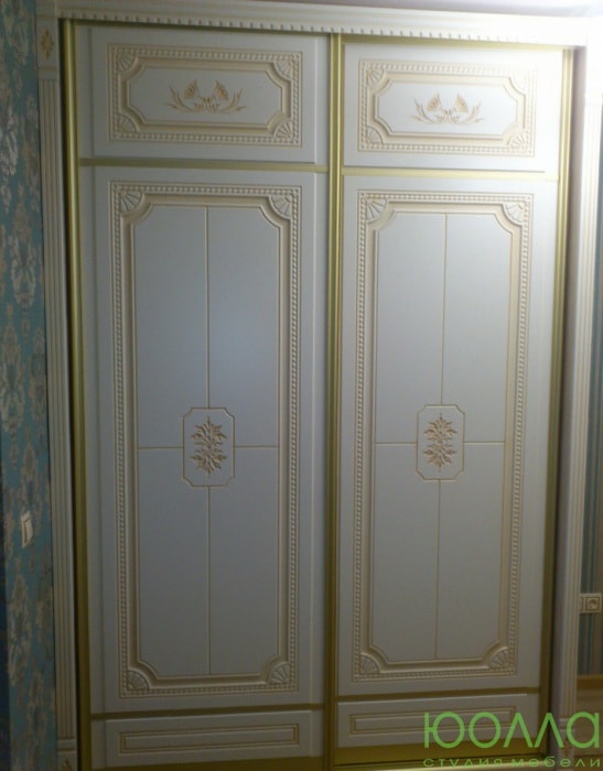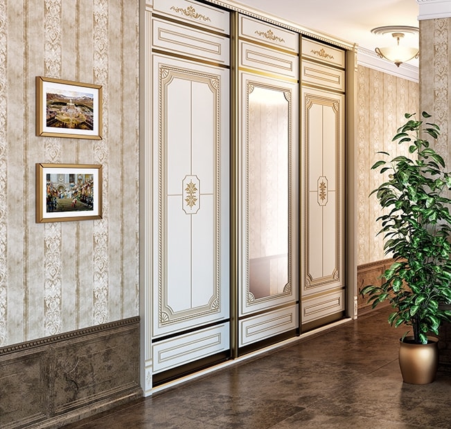 Встроенный трехстворчатый шкаф-купе в викторианском стиле. Светлые фасады в золостистом профиле лаконично украшены барочным орнаментом. Крем с патиной является оптимальным цветом для классического стиля. Двери-купе составляются из стандартных модулей в зависимости от ширины и высоты проема, и могут обрезаться до 100 мм. Стандартный цвет дверей - крем + патина.