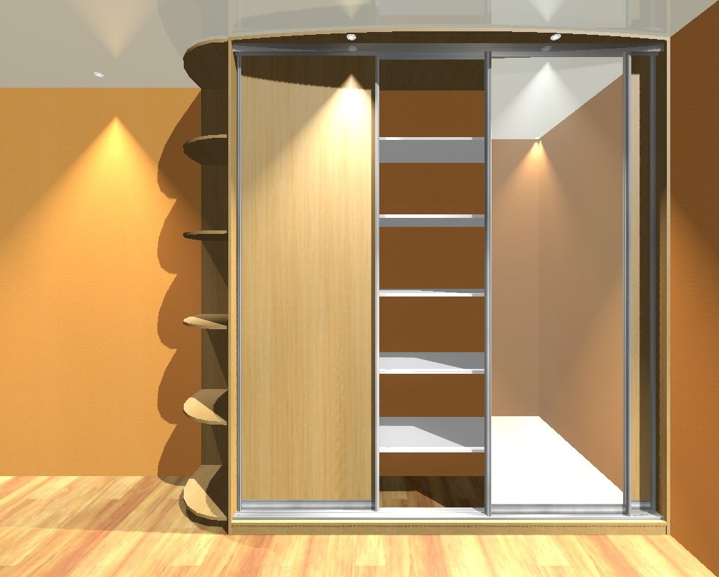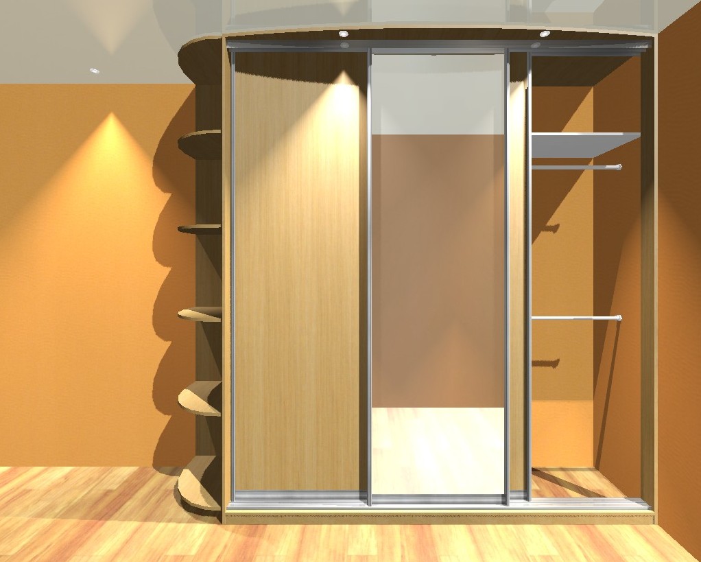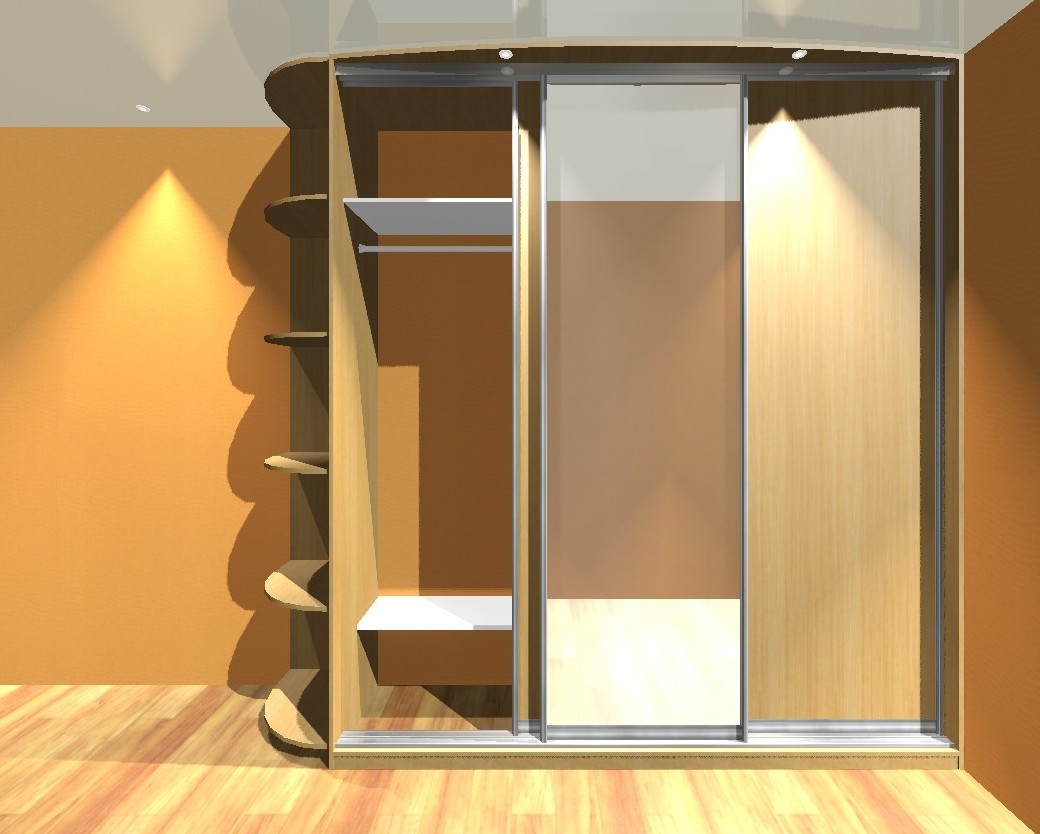 Шкаф-купе выдержан в теплых тонах древесины, центральная створка зазеркалена. Приставная секция с закругленными полками маскирует угол.