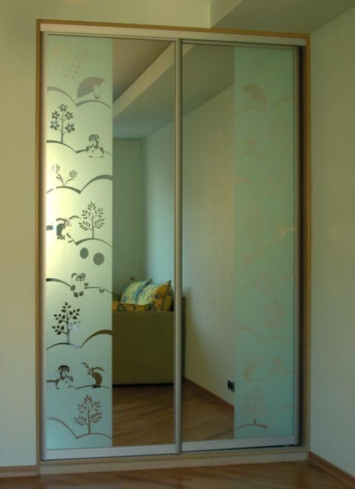 Данная модель шкафа-купе подойдет в комнату любых размеров. Несмотря на свой компактный размер, шкаф оснащен большим количеством полок. Двери зеркальные в алюминиевом профиле и декорированы пескоструйным рисунком. Узор зависит только от ваших предпочтений.