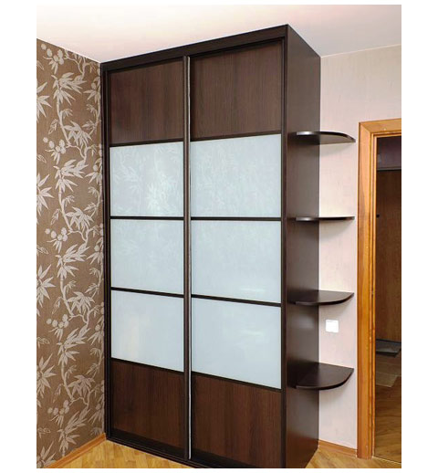 Корпус линейного шкафа выполнен в стильном и привлекательном коричневом цвете с приятной древесной текстурой. Раздвижные створки в свою очередь также дополнены вставками из белого глянцевого лакобеля в центральной части. Внутренне наполнение может быть выполнено на заказ, относительно предпочтений и требований заказчика.
