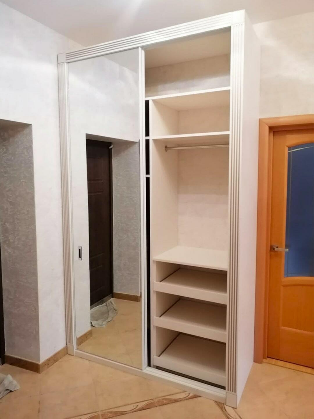 Корпусный шкаф-купе древесного оттенка с одним зеркалом. Ширина 112 см.