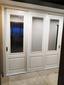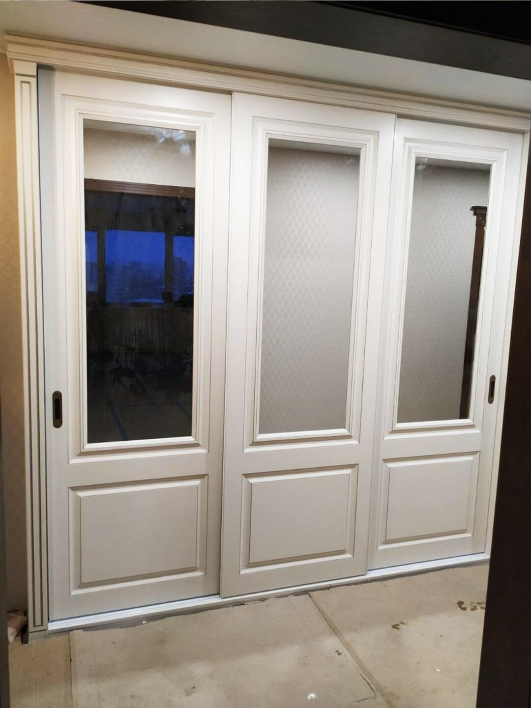 Каркас шкафа белого цвета. Двери из лакобеля и разделены алюминиевыми рейками.