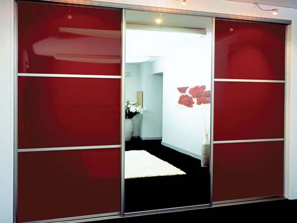 Современный встраиваемый шкаф-купе с навесной подсветкой. Две створки шкафа выполнены в красном глянцевом цвете, одна створка остеклена зеркалом по периметру.