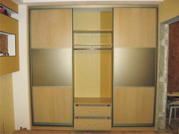 Шкаф-купе с тремя дверями в виде квадратов отлично будет смотреться в вашей квартире. Он очень удобный и вместительный. Внутри находятся два отдела с вешалками для одежды, один – с полочками для белья.