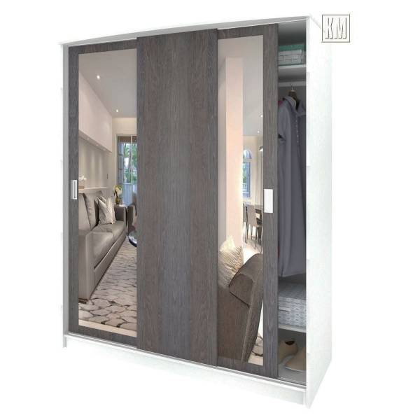 Белый шкаф-купе с серебристым профилем. Три раздвижные створки на системе Senator.