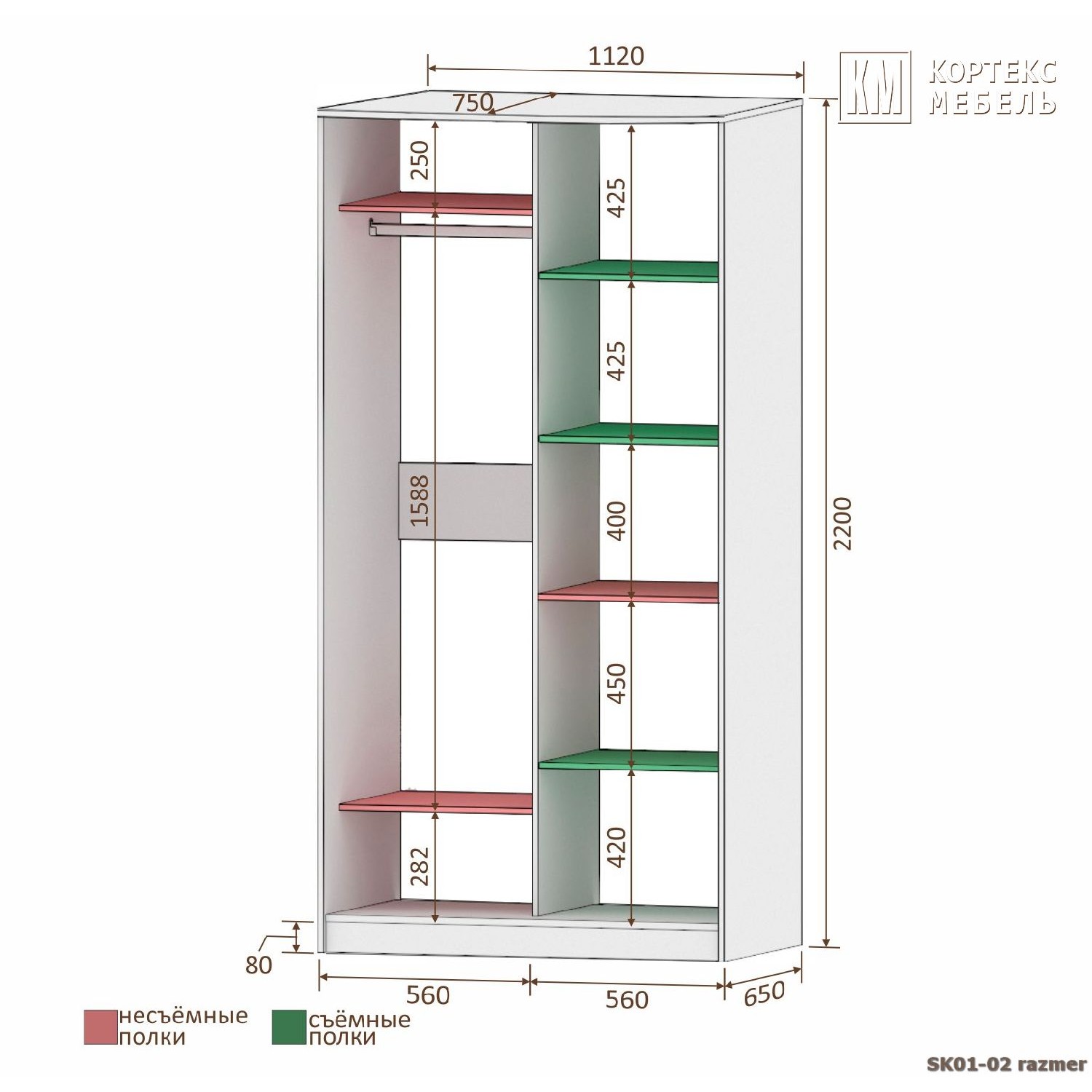 Размеры: (ШхВхГ): 1120х2200х650 мм.