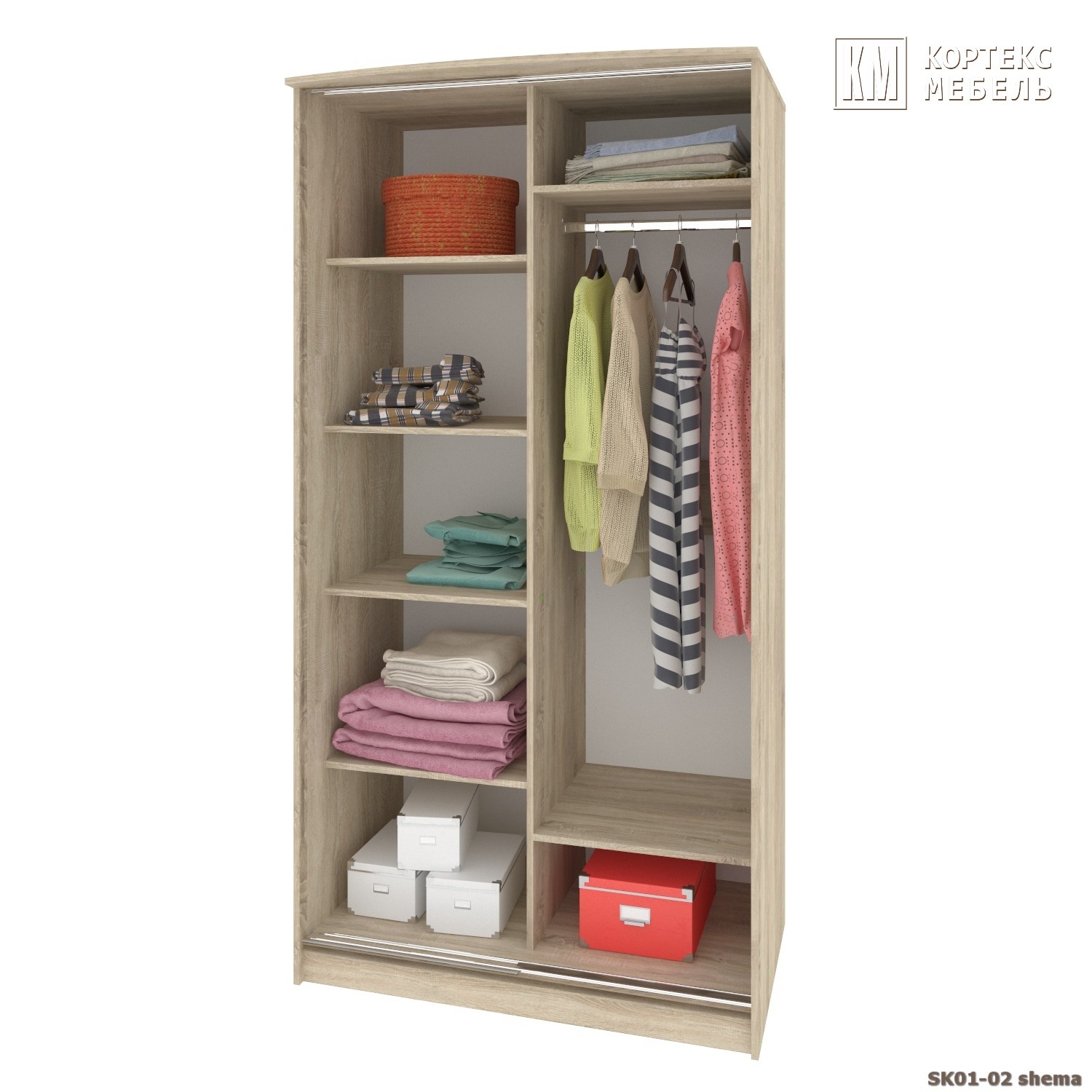 Компактный 2-х дверный шкаф для одежды на два отделения равной ширины. Левое отделение оборудовано штангой для хранения одежды на плечиках, нижней полкой и антресолью. Правое отделение имеет 4 полки, 3 из которых съёмные.