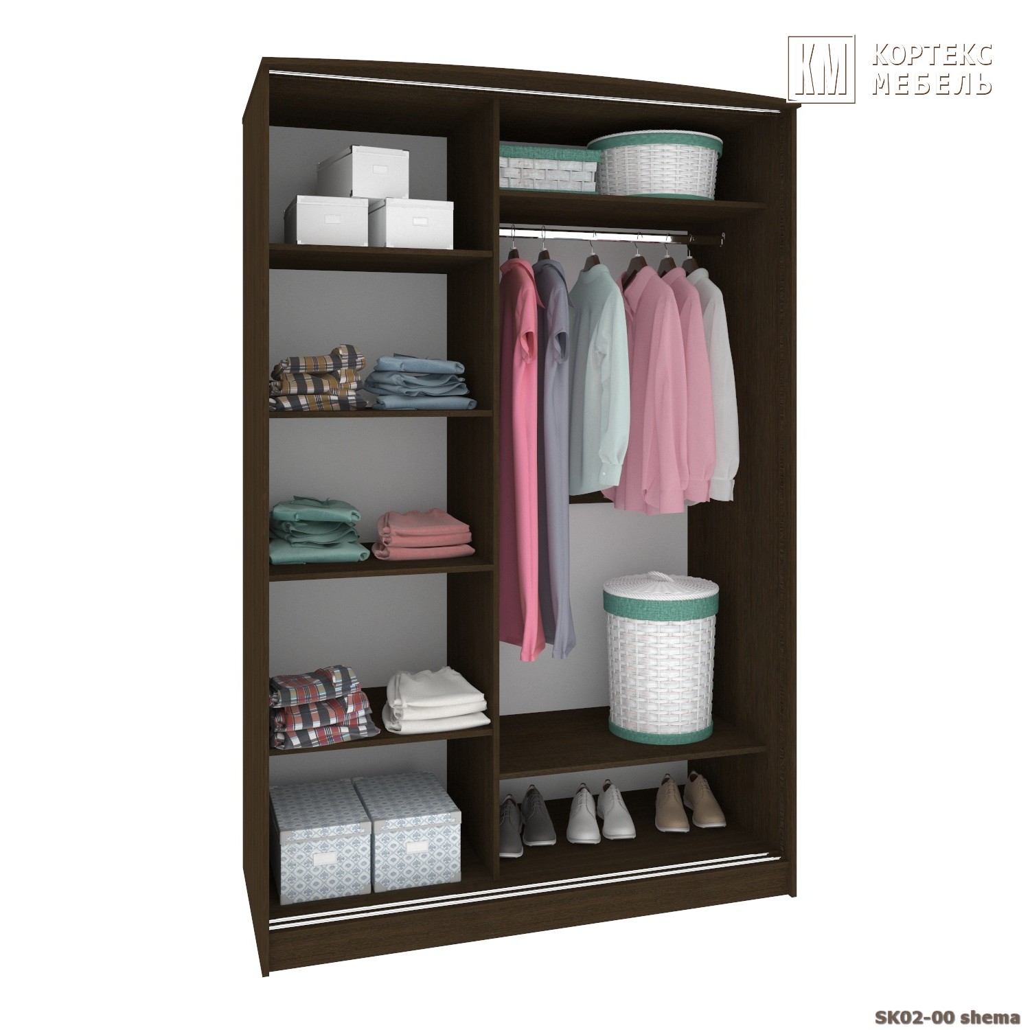 Удобный 2-х дверный шкаф для одежды на два отделения. Левое отделение шириной 86см оборудовано штангой для хранения одежды на плечиках, нижней полкой и антресолью. Правое отделение имеет 4 полки, 3 из которых съёмные. Модель ЛАГУНА ШК02-00 исполнена без зеркал.