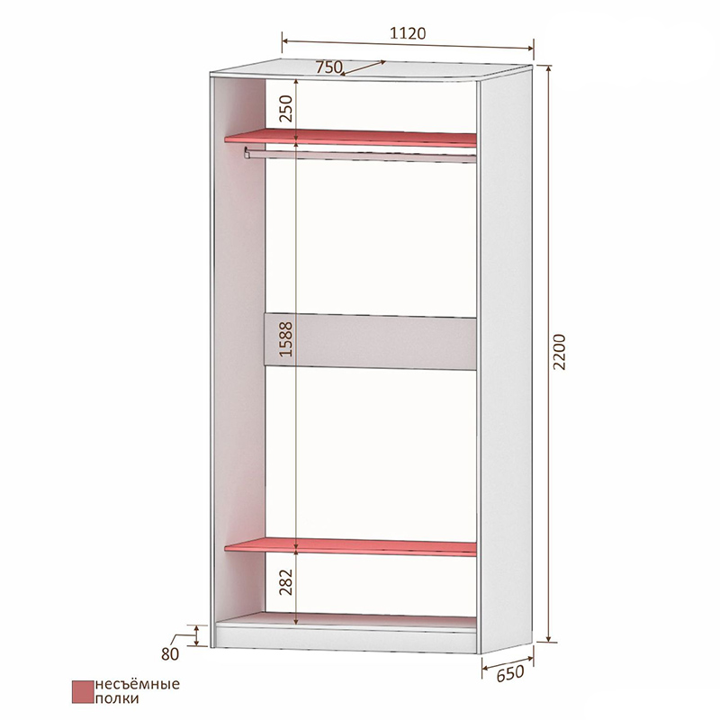 Наполнение шкафа – одно отделение со штангой для хранения одежды на плечиках, нижней полкой, антресолью.