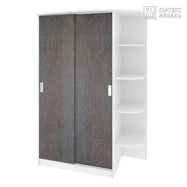 Темный шкаф-купе без зеркал с открытыми полками справа. Ширина 152 см.