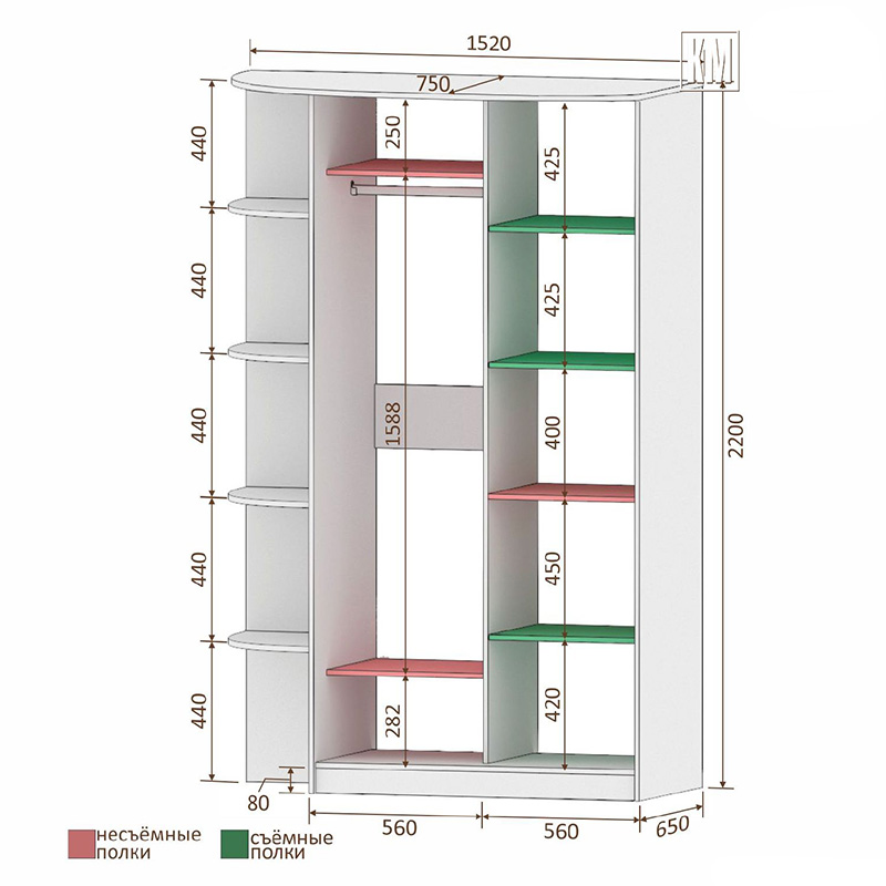 Наполнение шкафа – два отделения равной ширины + консоль: