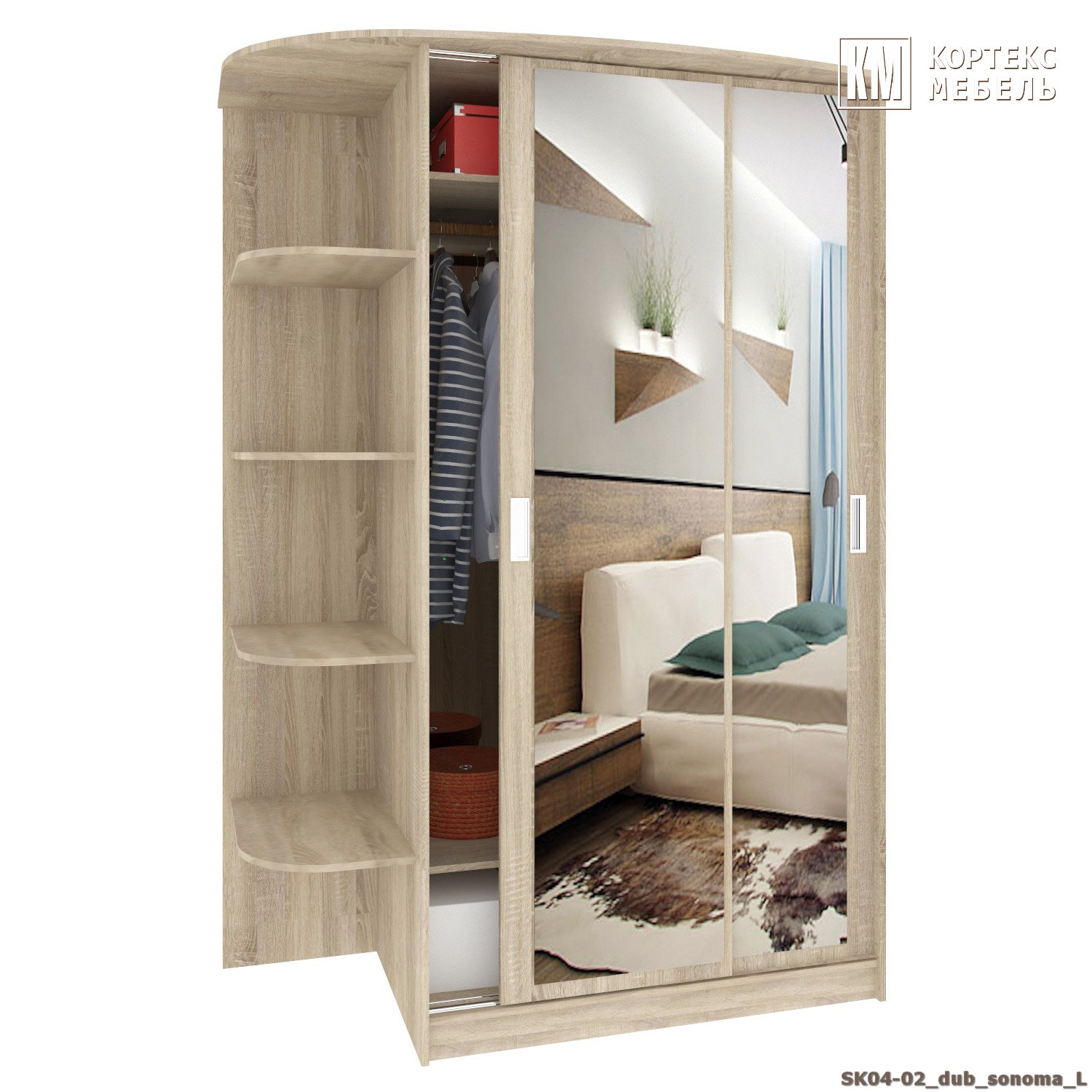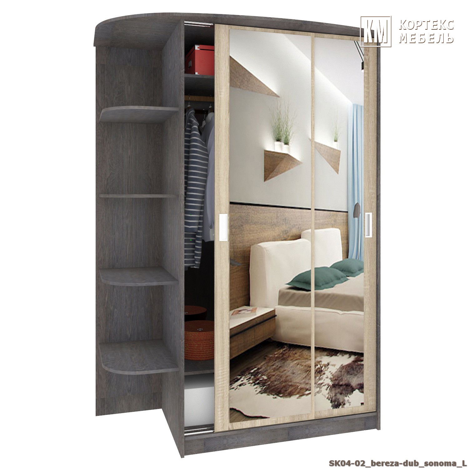 Компактный 2-х дверный шкаф для одежды на два отделения равной ширины с боковой консолью. Платяное отделение оборудовано штангой для хранения одежды на плечиках, нижней полкой и антресолью. Второе отделение имеет 4 полки, 3 из которых съёмные. Боковая консоль с 4-мя фиксированными полками удобна для размещения небольших предметов интерьера и часто используемых вещей. Модель ЛАГУНА ШК04-02 исполнена с двумя зеркалами. Зеркала крепятся в производственных условиях и поставляются в наклеенном состоянии.