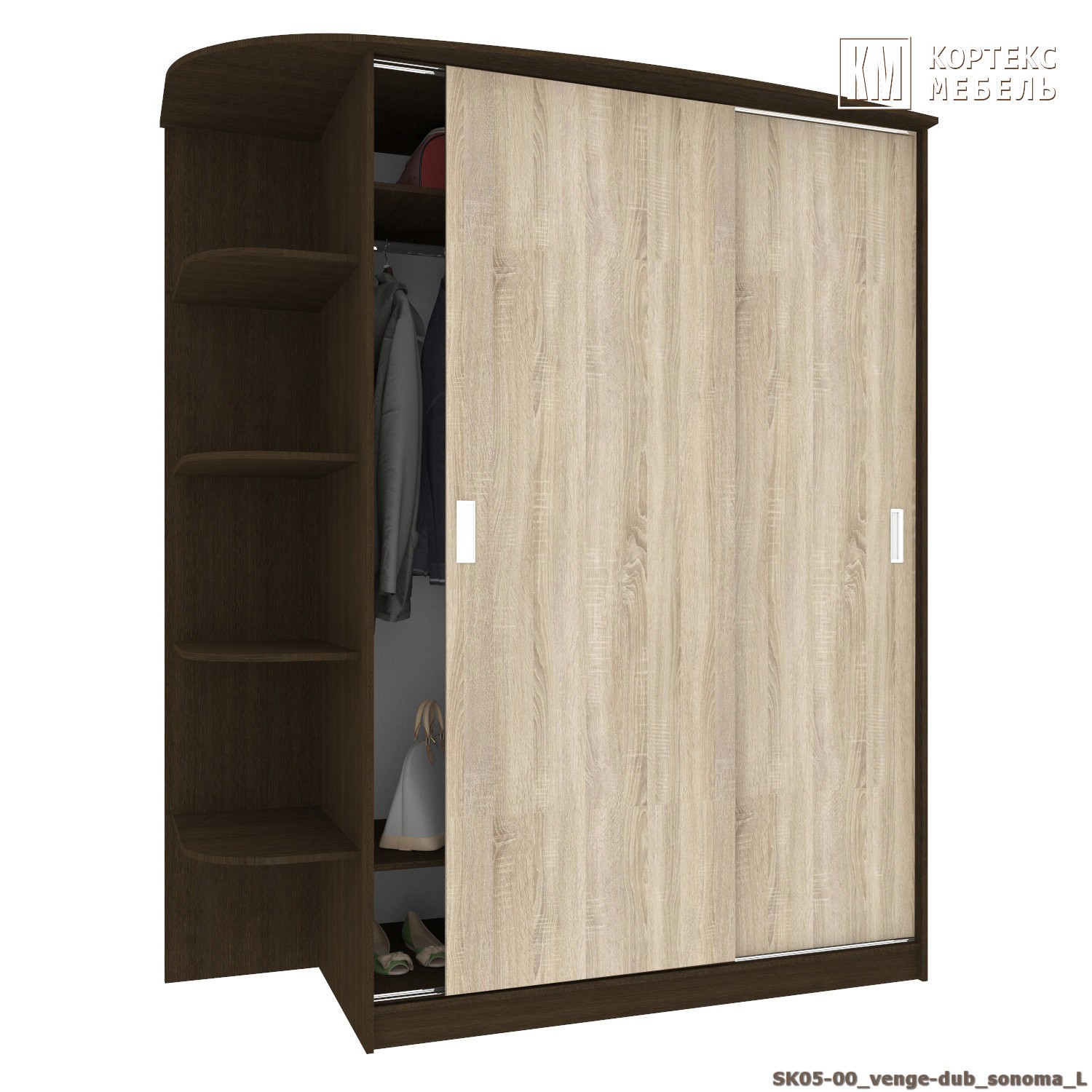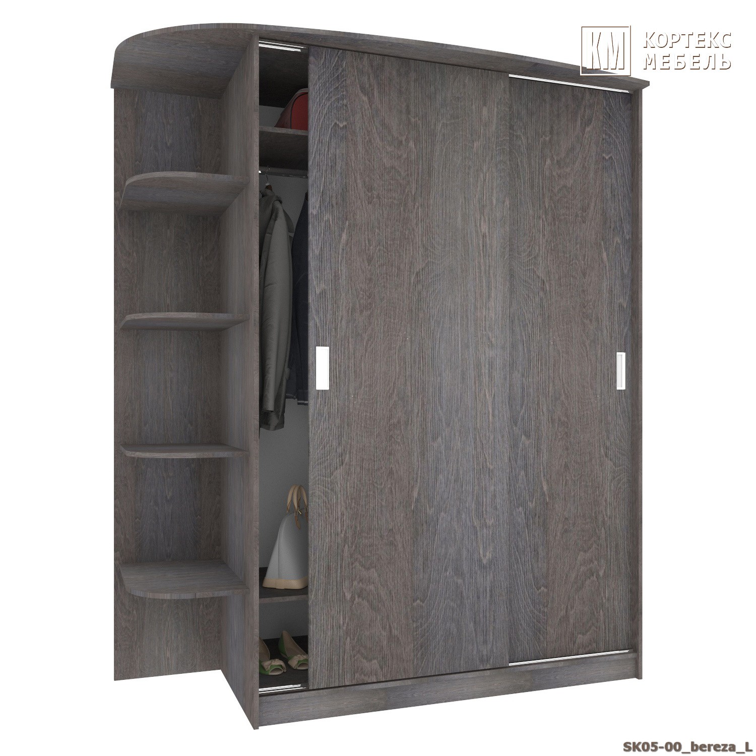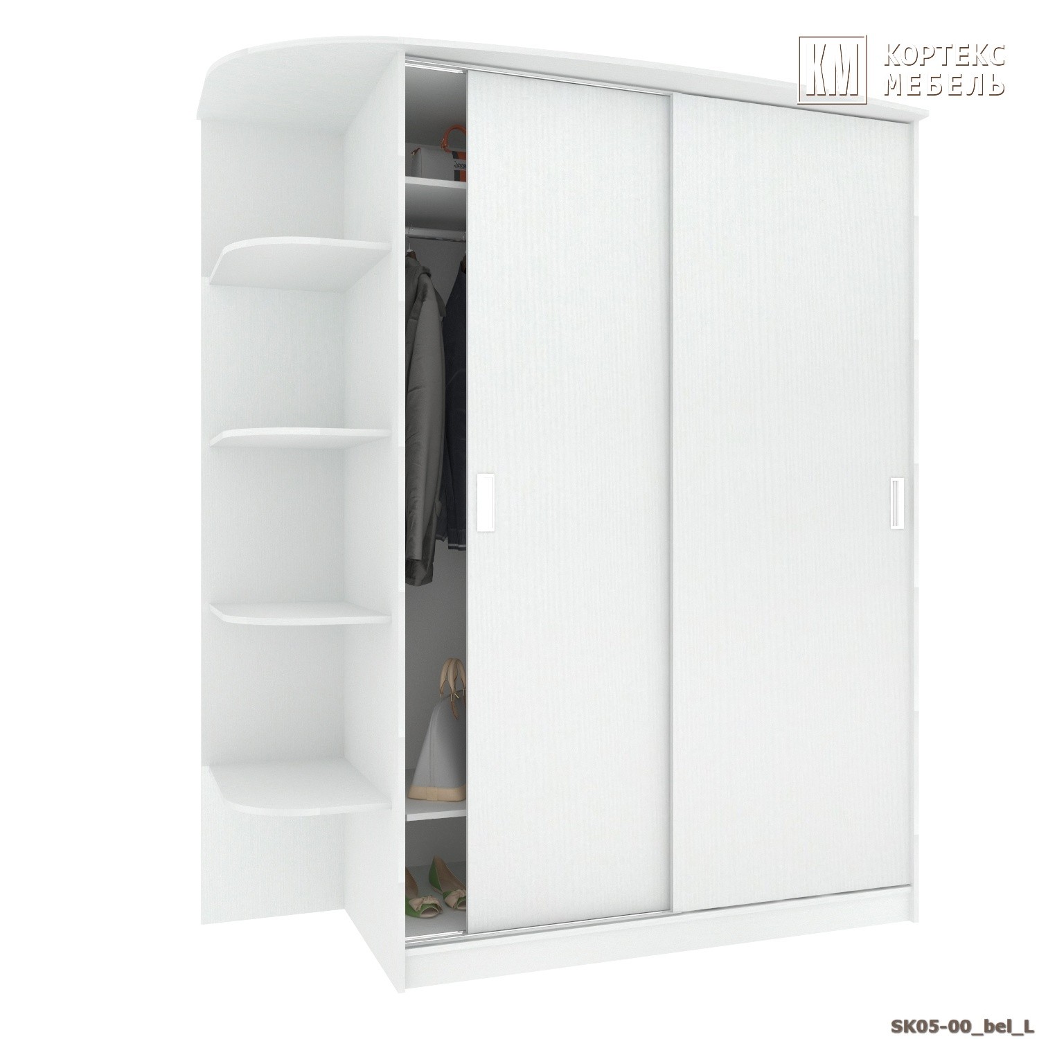 Удобный 2-х дверный шкаф для одежды на два отделения с боковой консолью. Платяное отделение оборудовано штангой для хранения одежды на плечиках, нижней полкой и антресолью. Второе отделение имеет 4 полки, 3 из которых съёмные. Боковая консоль с 4-мя фиксированными полками удобна для размещения небольших предметов интерьера и часто используемых вещей. Модель ЛАГУНА ШК05-00 исполнена без зеркал.