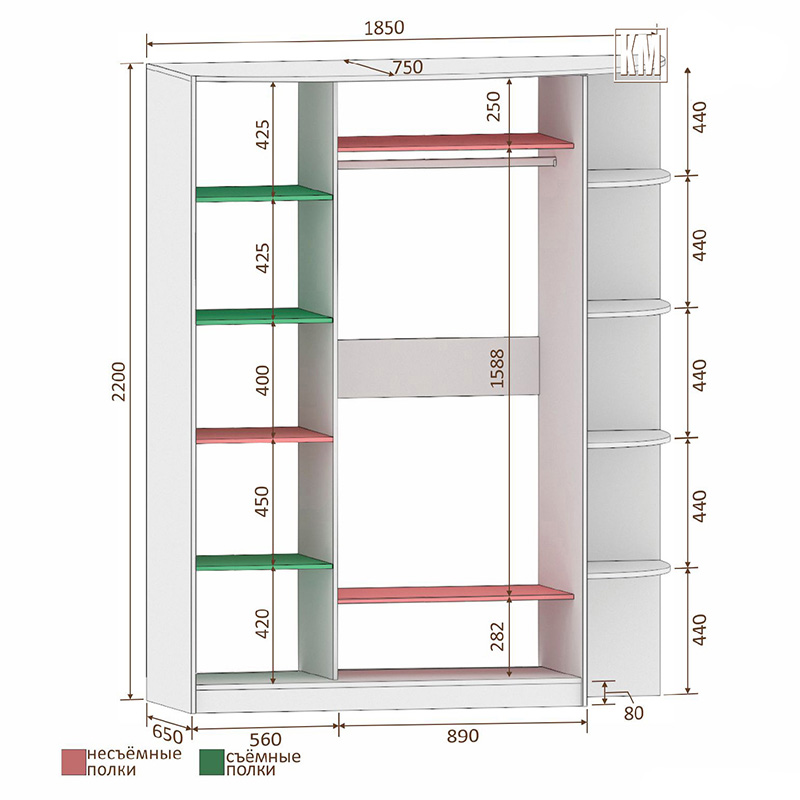 - Правое отделение – штанга для хранения одежды на плечиках, нижняя полка, антресоль.