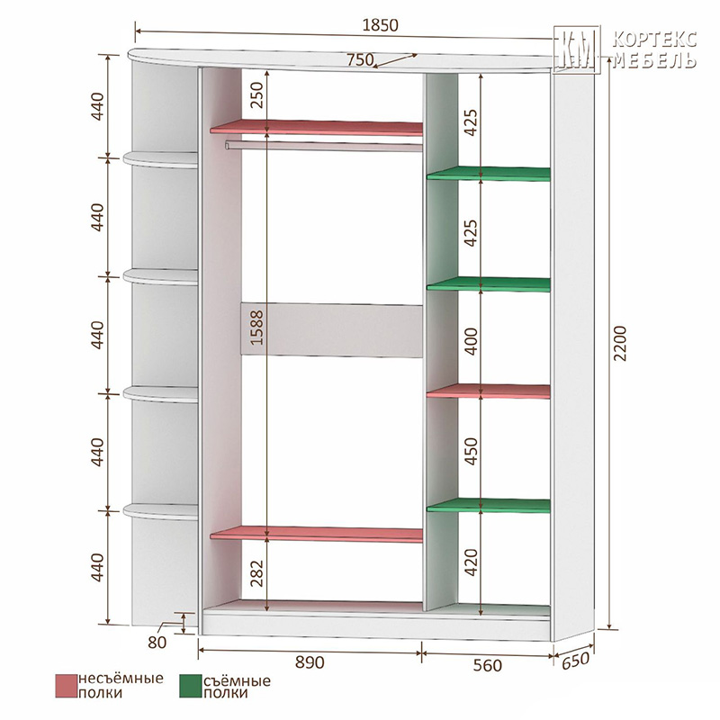 - Левое отделение – штанга для хранения одежды на плечиках, нижняя полка, антресоль.