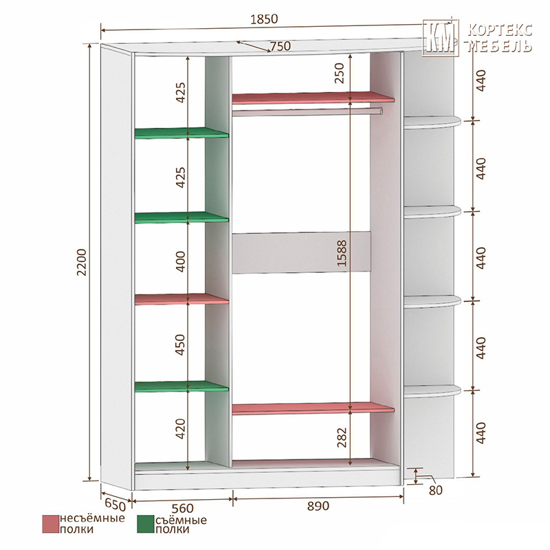 - Правое отделение – штанга для хранения одежды на плечиках, нижняя полка, антресоль.