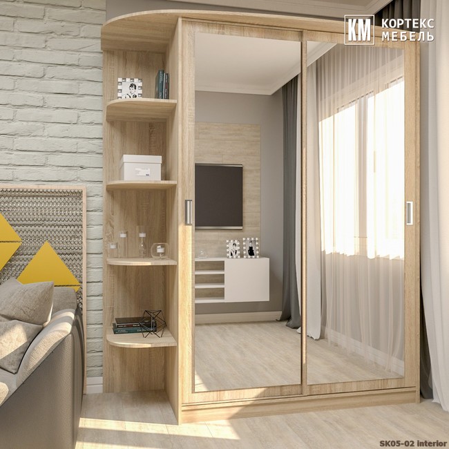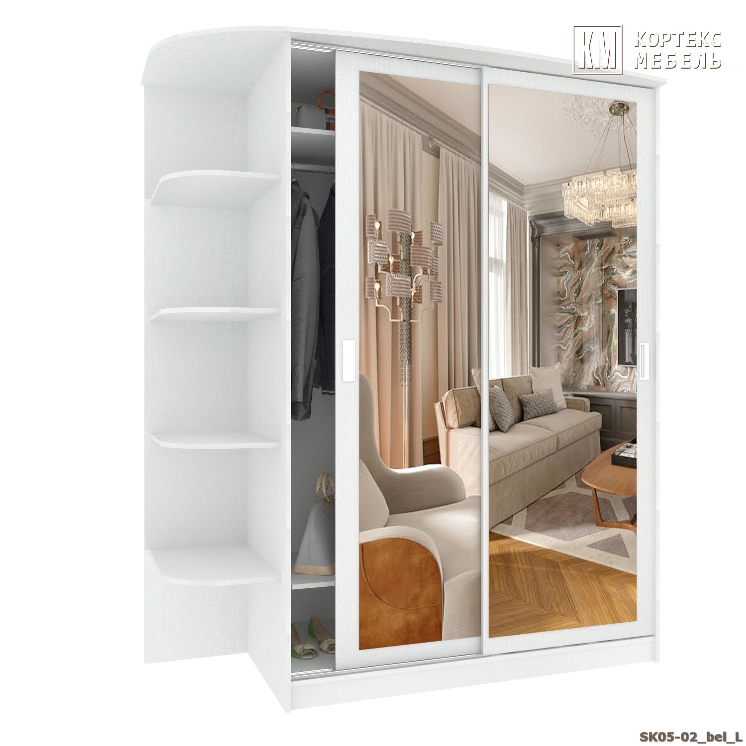 Удобный 2-х дверный шкаф для одежды на два отделения с боковой консолью. Платяное отделение оборудовано штангой для хранения одежды на плечиках, нижней полкой и антресолью. Второе отделение имеет 4 полки, 3 из которых съёмные. Боковая консоль с 4-мя фиксированными полками удобна для размещения небольших предметов интерьера и часто используемых вещей. Модель ЛАГУНА ШК05-02 исполнена с двумя зеркалами. Зеркала крепятся в производственных условиях и поставляются в наклеенном состоянии.