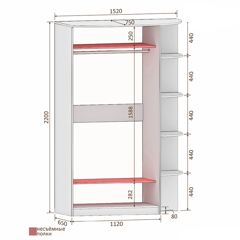 - Отделение со штангой для хранения одежды на плечиках, нижней полкой и антресолью.