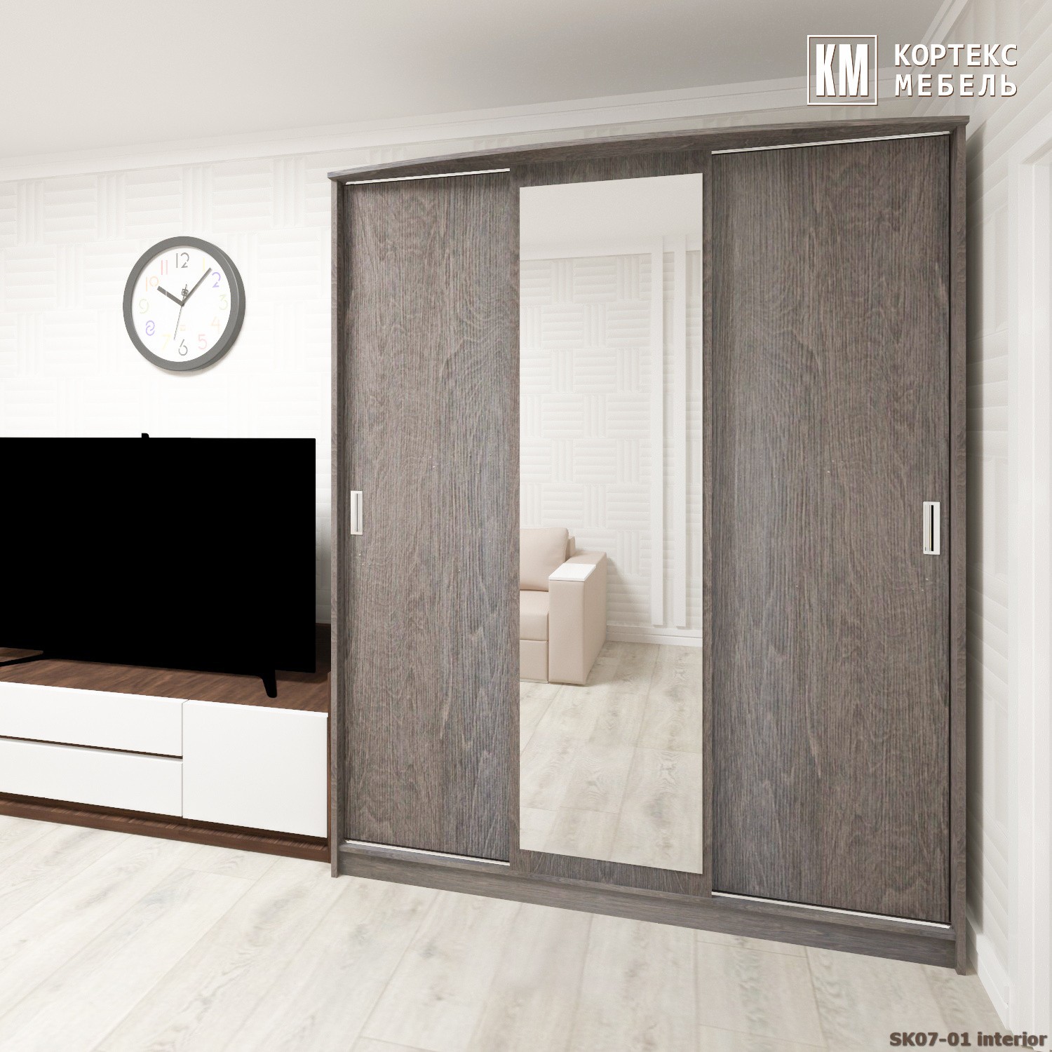Темный корпусный шкаф-купе с двумя зеркалами в полный рост.