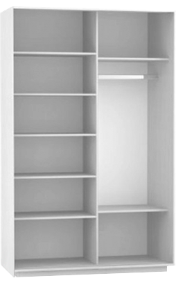 Две секции внутри. В правой части находятся полки, в левой – металлическая штанга и антресоль.
