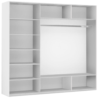 Три отсека шкафа с полками и тремя штангами.