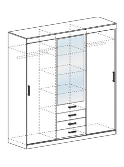 код 129729Три отсека шкафа с полками, двумя штангами, четырьмя выдвижными ящиками.