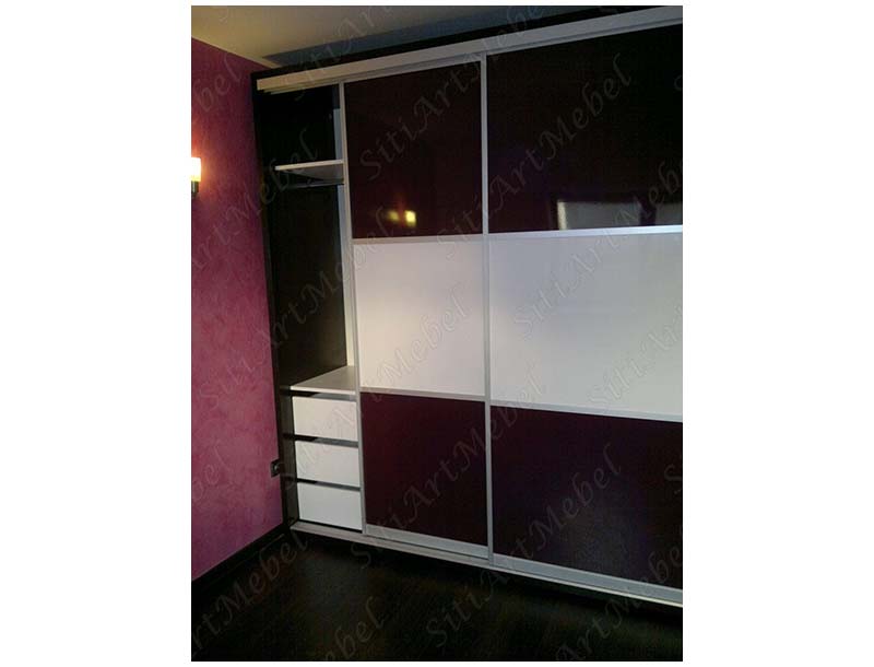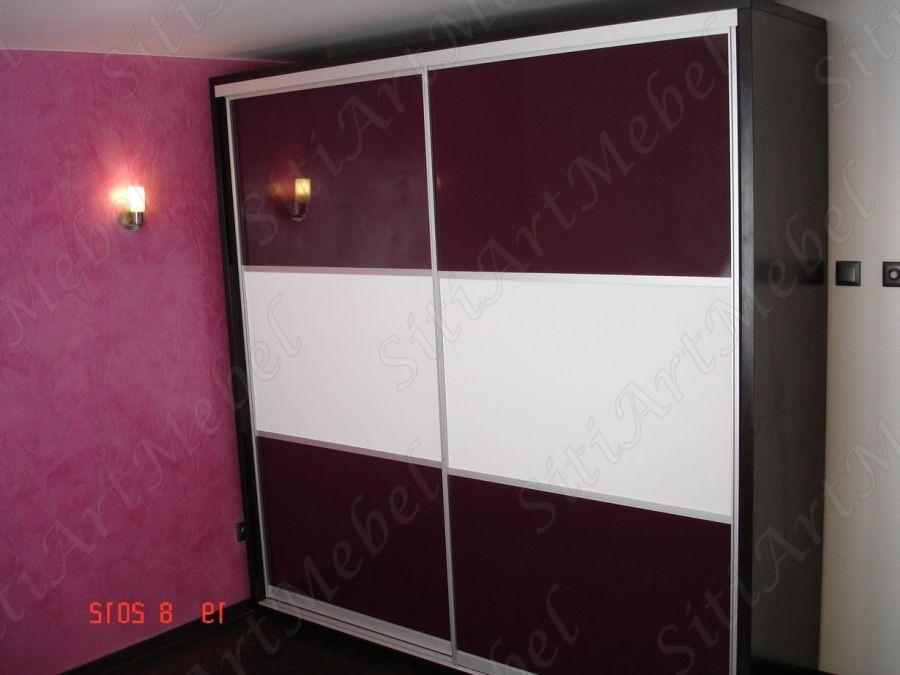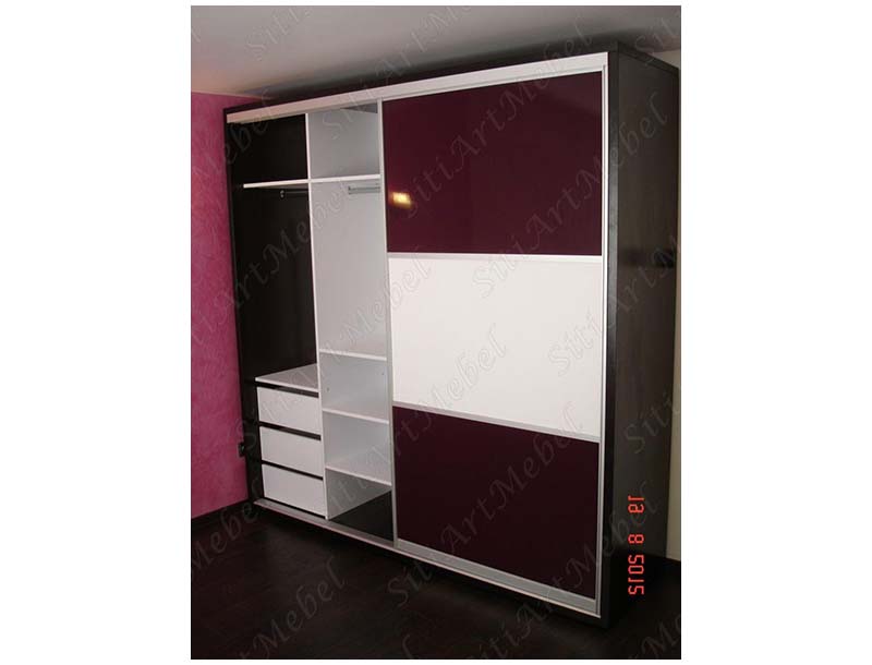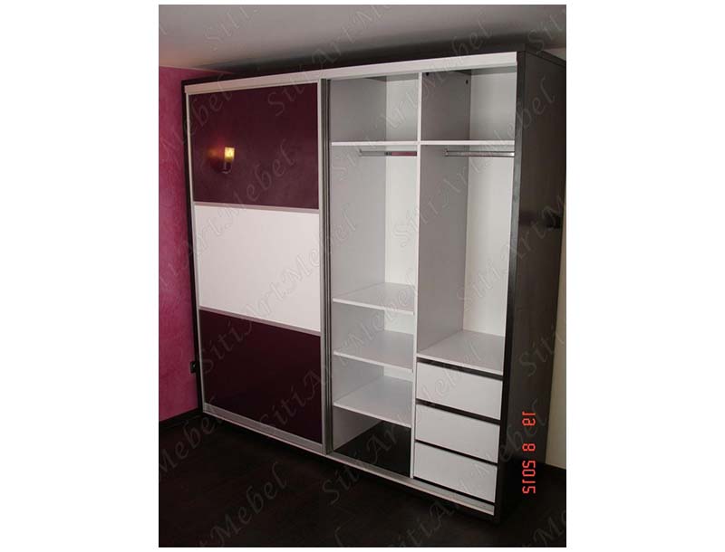 Вместительный двустворчатый шкаф-купе с лилово-белым фасадом отлично впишется в любой интерьер. Для лучшей работы створки шкафа оформлены в алюминиевую рамку. За счет стандартного внутреннего наполнения вы сможете всю свою одежду хранить в полном порядке.