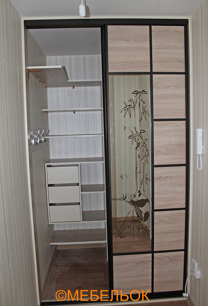 Светлый шкаф-купе с древесным рисунком на фасаде и корпусе. Вставки полуматового стекла по центру.