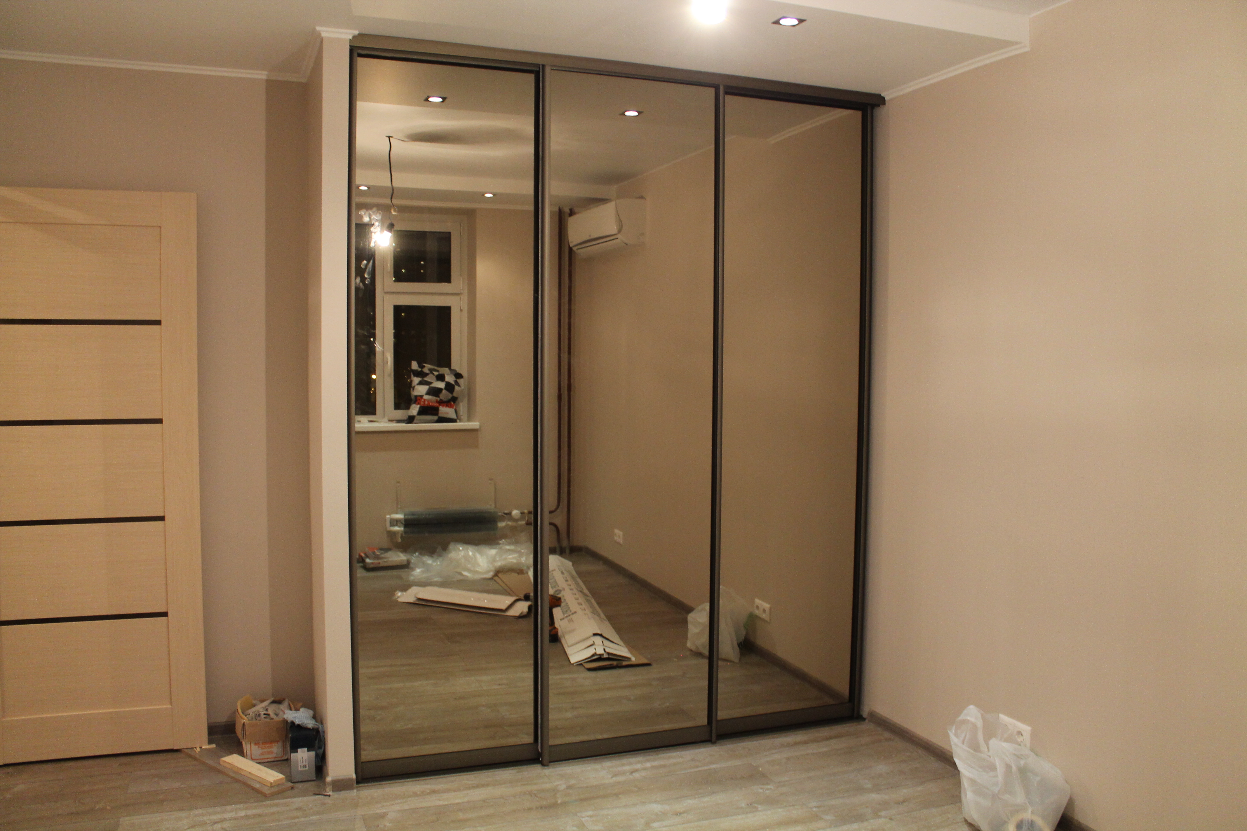 Встроенный в нишу гардеробный шкаф-купе на три узкие высокие створки с зеркальным фасадом оттенка «бронза», матовый бежево-коричневый профиль в расцветке шампань. Удобное наполнение позволит разместить в шкафу все необходимые вещи. Крупные зеркальные створки позволят рассмотреть себя в полный рост.