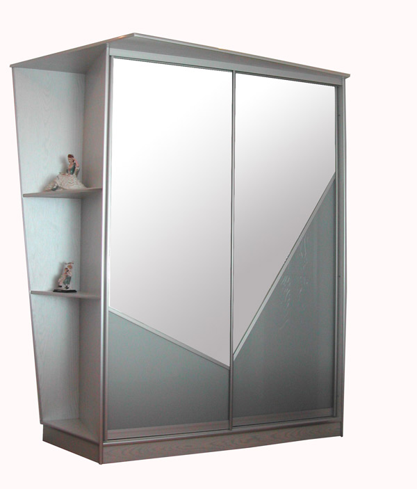 Шкаф-купе приятный серебристый цвет, который придает ему футуристичный внешний вид. Модель дополнена двумя угловыми полками. Внутри предусмотрено большое количество полок и штанга для вешалок.