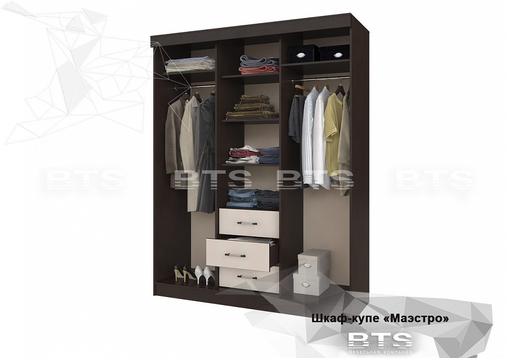Шкаф-купе с глухими створками. Внутри находится два ящика, полки и штанга.
