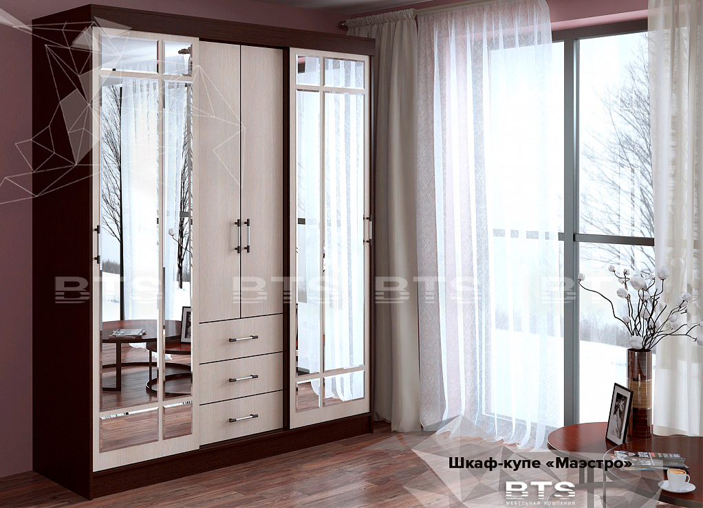 Обратите внимание, что шкаф-купе «Маэстро» может быть дополнен зеркалом, что придаст интерьеру дополнительную глубину и свет.