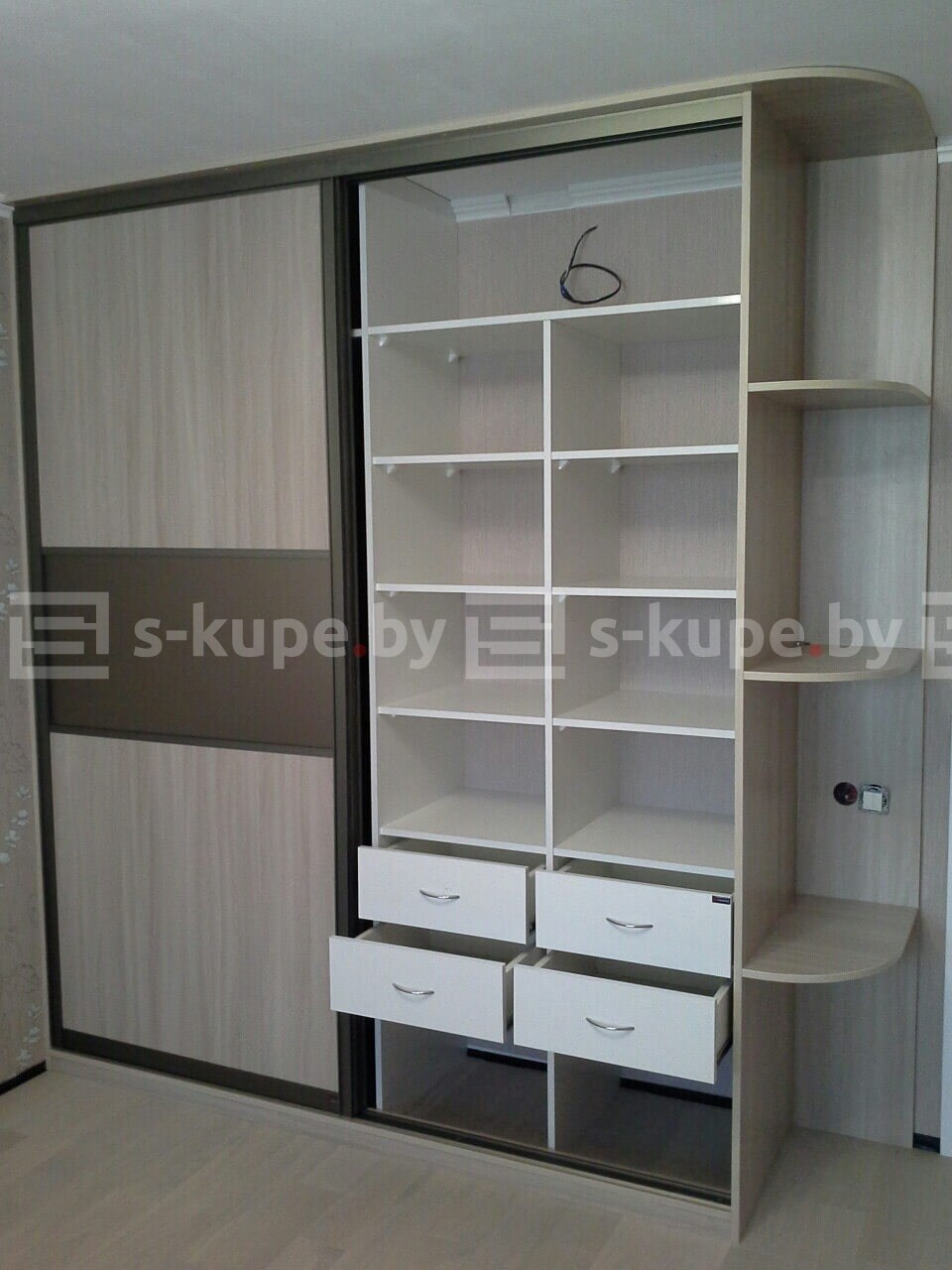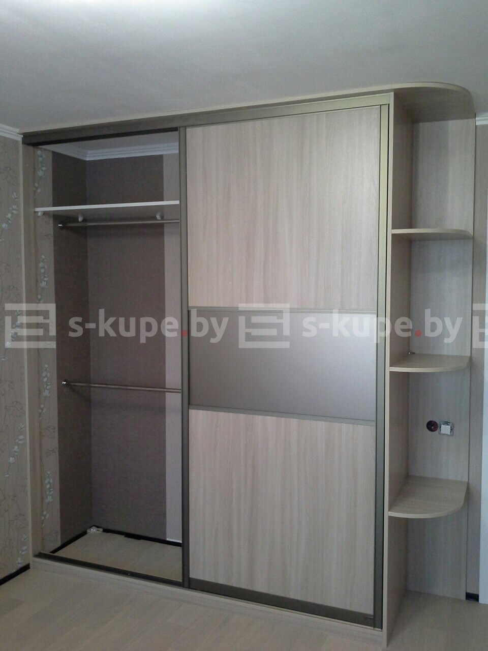 Шкаф-купе на две створки под дерево с глянцевой вставкой сатинового зеркала по центру. Имеется также боковая секция на три радусные полки в тон фасаду.