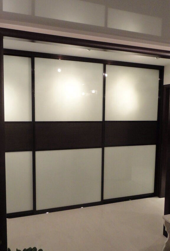 Трехстворчатый линейный шкаф-купе установлен в нишу в стене, что позволяет полностью использовать полезное пространство и не перегрузить его. Три раздвижные створки выполнены в комбинированном цвете: каркас и профиль в цвете венге, вставки из белого глянцевого лакобеля. Внутреннее наполнение выполняется по требованиям заказчика.