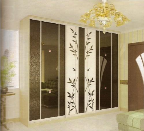 В оформлении использованы бронзовое зеркало, экокожа, белый лакобель, украшенный рисунком прокрашенного пескоструя. Интересное дизайнерское решение как бы «растворяет» среднюю дверь между двумя крайними. Вертикальные полоски профиля придают строгость и завершенность всему проекту.