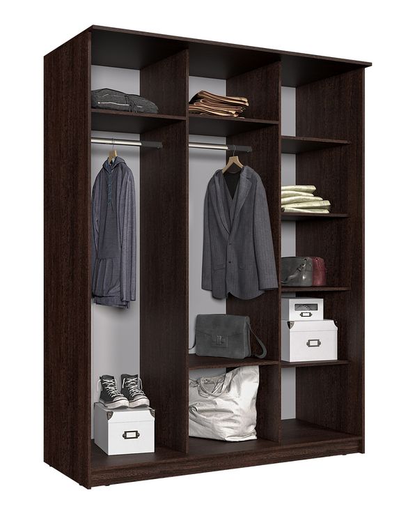 Три отсека шкафа с полками, двумя штангами, четырьмя выдвижными ящиками.