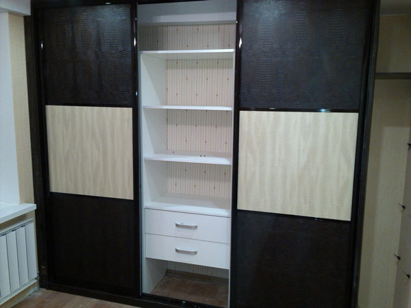 Шкаф-купе с тремя раздвижными дверцами, декорированными искусственной кожей. В средней части расположены три открытых полки для одежды и два выдвижных ящика.